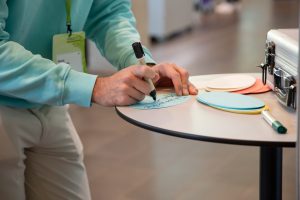 Am Mittwochmorgen, nach einer kurzen Nacht, verteilten sich die Teilnehmer:innen im Anschluss an eine kompakt gehaltene Einführungsrunde auf die angebotenen Workshops. Bei diesem Format stellten sich die Expert:innen der Sponsoren bewaffnet mit Pinnwand und Moderatorenkoffer zu einem selbstgewählten Thema den Teilnehmer:innen in 10er-Gruppen.