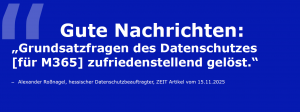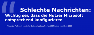 Die Diskussion zeigte, dass M365 als dynamisches Produktportfolio mit zahlreichen Einzelanwendungen strukturell schwer beherrschbar ist. Regelmäßige Funktionsupdates, neue Produkte wie Copilot sowie komplexe Abhängigkeiten zwischen einzelnen Einstellungen erschweren eine konsistente Datenschutzbewertung erheblich. Verbindliche, allgemein anerkannte Best‑Practice‑Konfigurationen existieren bislang weder seitens Microsoft noch seitens der Aufsichtsbehörden.